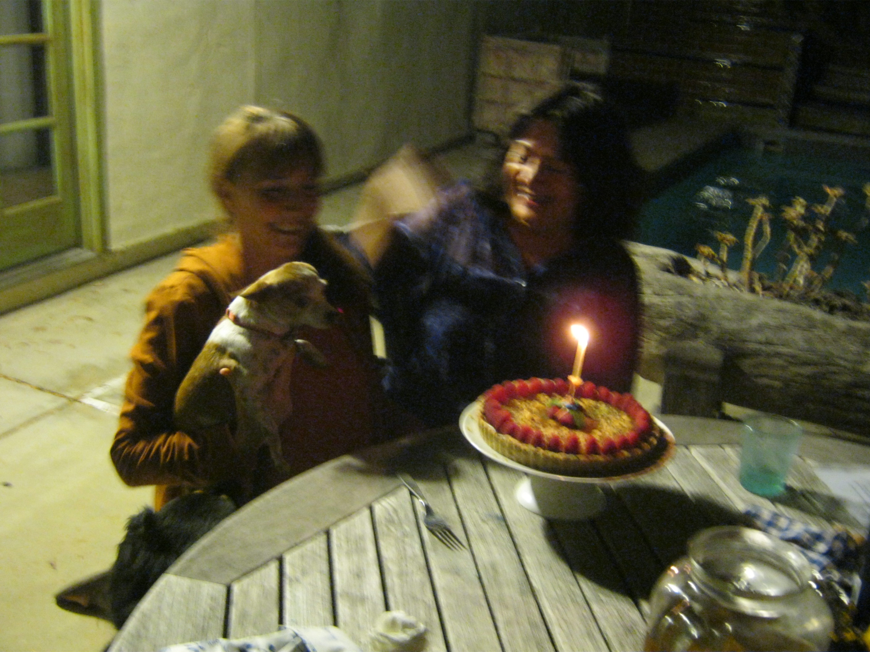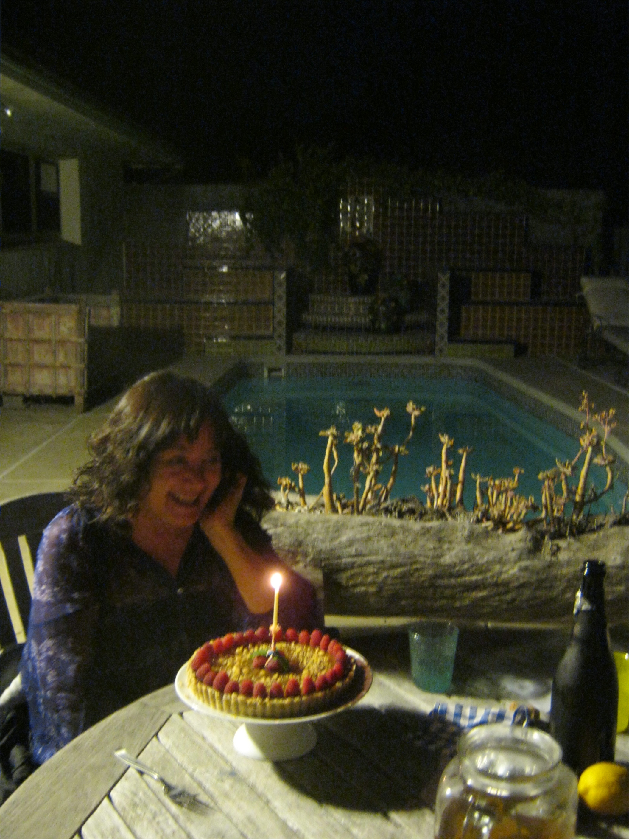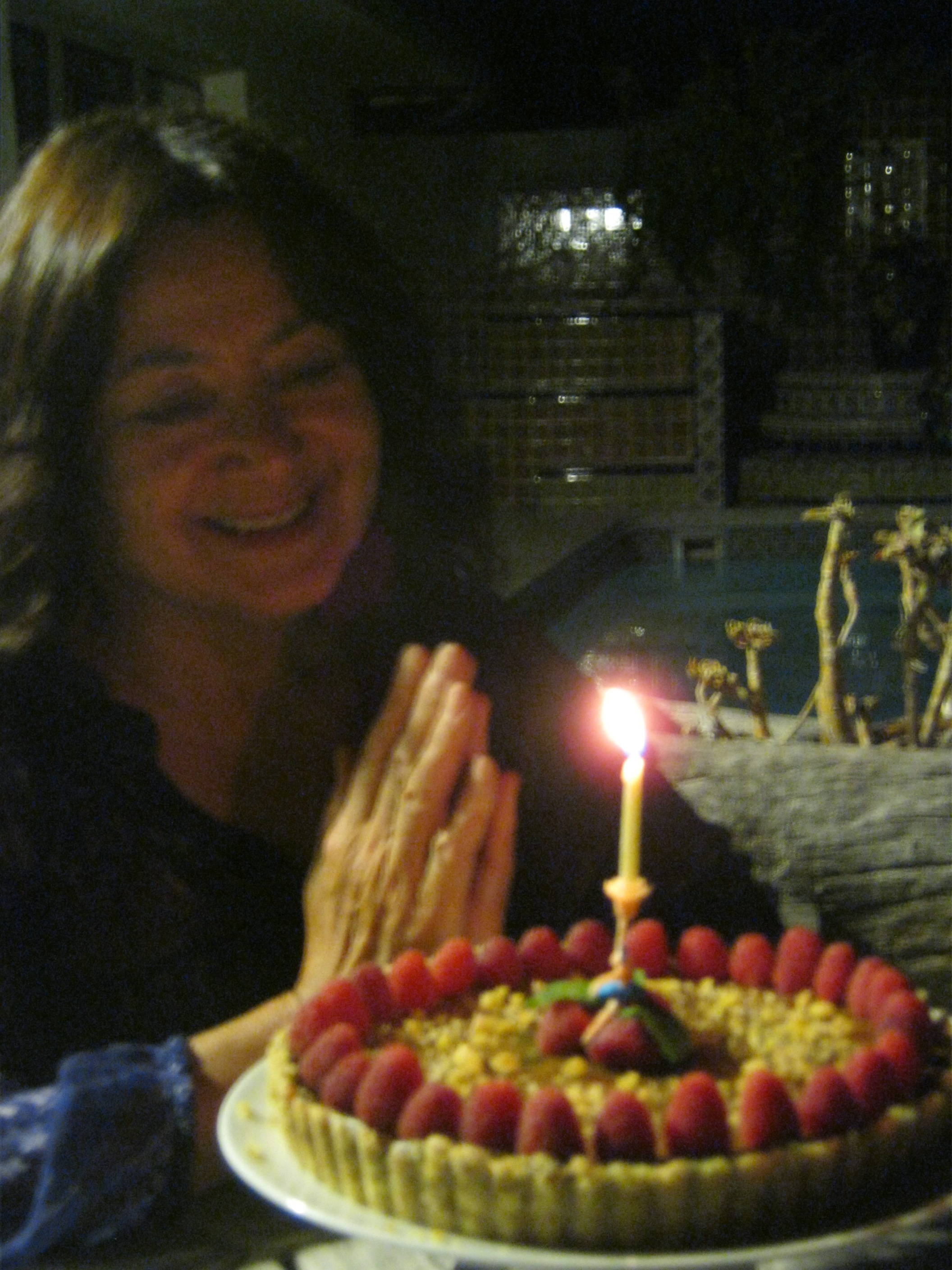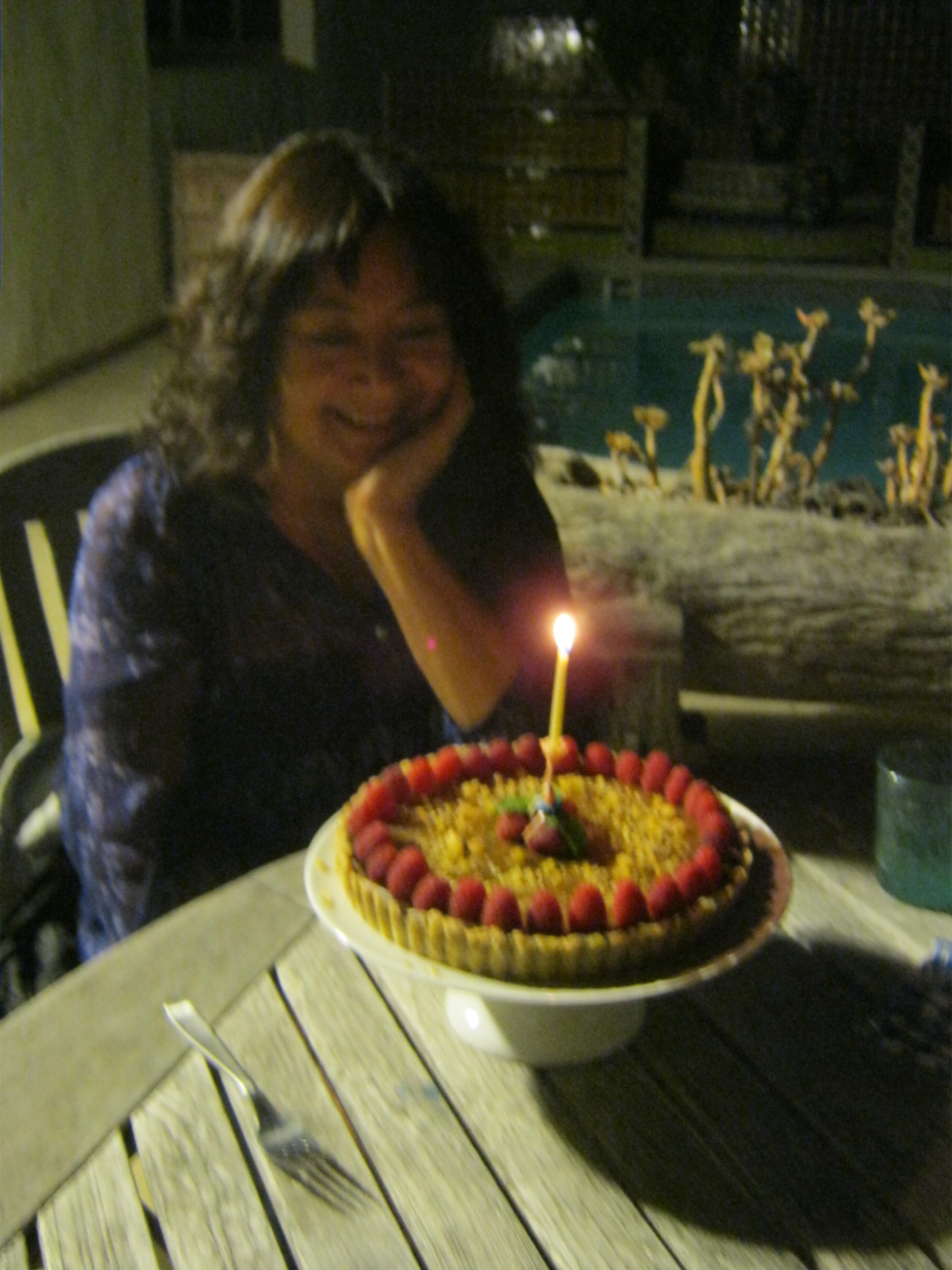 Surprise 65th birthday cake delight— raw vegan avocado chocolate coconut raspberry with a soaked almond crust–made by Vegan Chef Sunny Bower!