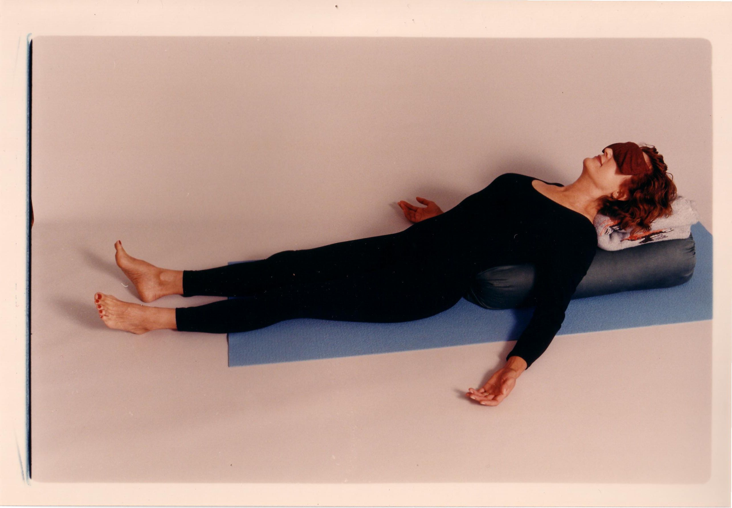 A bolster or folded cotton blanket under the legs, a ten-pound sandbag (or other weight) across the pelvis, and an eye pillow to quiet the movement of the eyes help the body to relax.